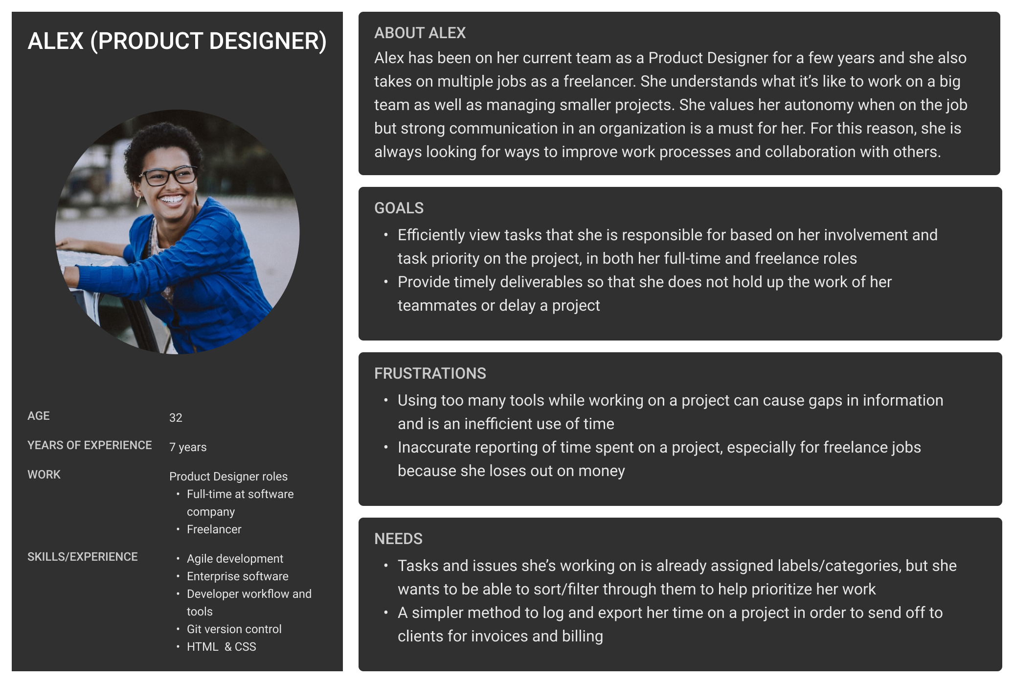 The research findings provided many insights, including the fact that teams want methods to streamline work processes. These insights were compiled to create the primary persona that will guide the next design steps.